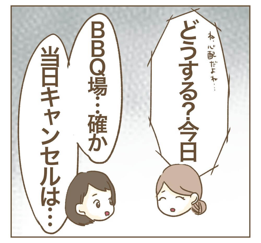 待ちに待ったBBQ当日。家族でお出かけ準備をしていたミオさんの元に届いたのは、案の定リエちゃんからのドタキャン連絡でした……。