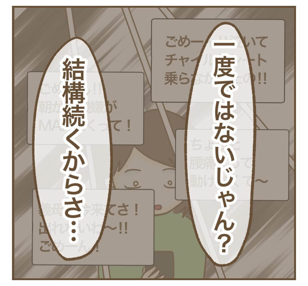 そもそもBBQを言い出したのはリエちゃん本人。それなのに、当日自分は平気な顔で別のママ友と楽しんでいる……。これまで何度も何度も繰り返されてきたドタキャンに、ミオさんの心はもう限界です。