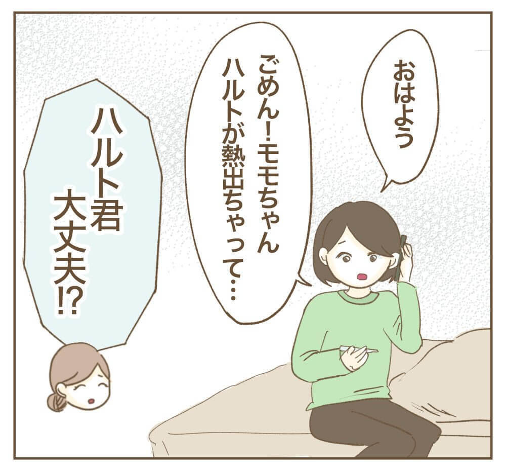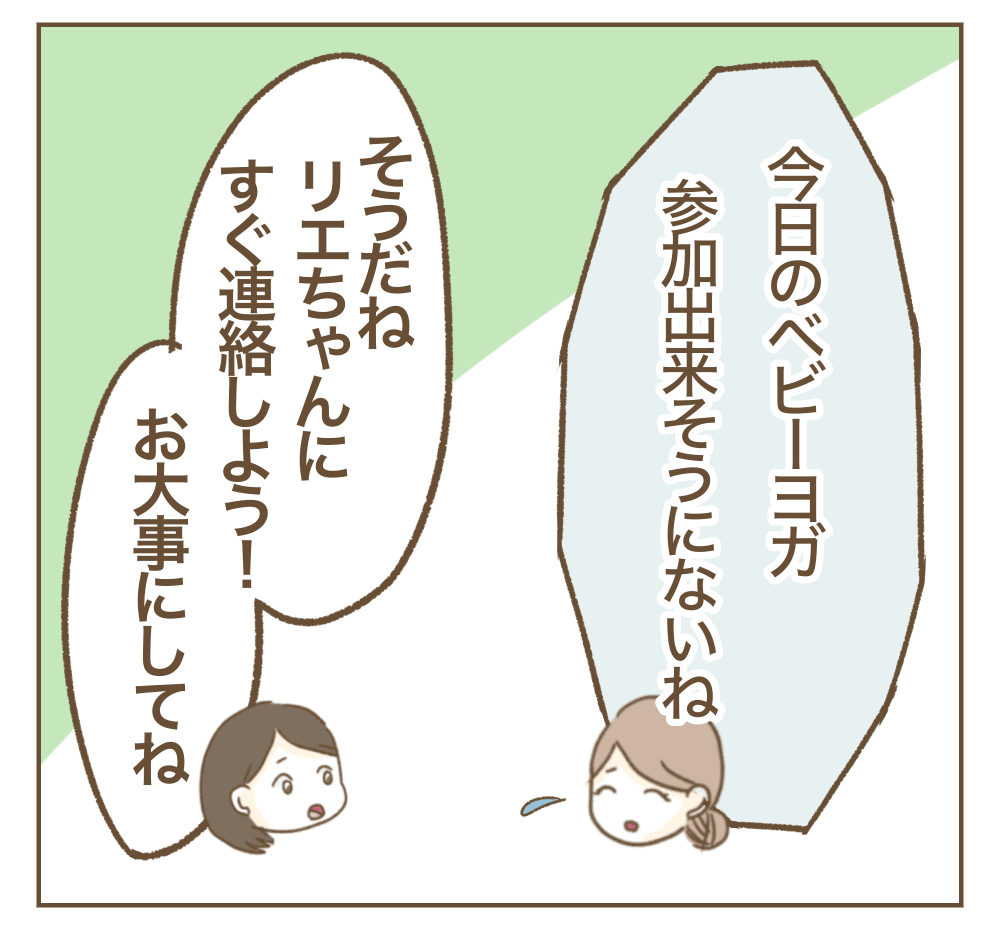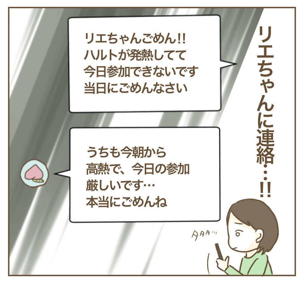 いよいよ約束のベビーヨガ当日。しかし、朝起きたミオさんが目にしたのは、高熱でぐったりする息子・ハルト君の姿でした。さらにはモモちゃんの家族もダウン……。二人はやむなくリエちゃんにキャンセルの連絡を入れます。
