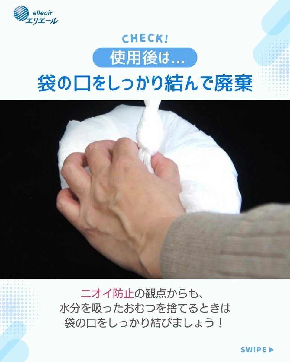 ニオイ防止の観点からも、水分を吸ったおむつを捨てるときは袋の口をしっかり結びましょう!
