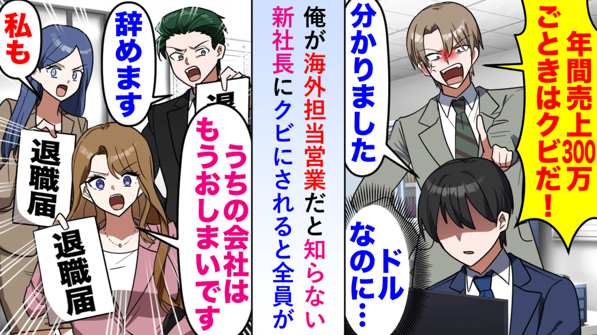 事の重大さに気づいた同僚の一人が、「社長、彼はドル建てで取引してるんですよ! 300万ドルですよ!?」と叫びましたが、新社長は「えっ、ドル……?」と呆然。