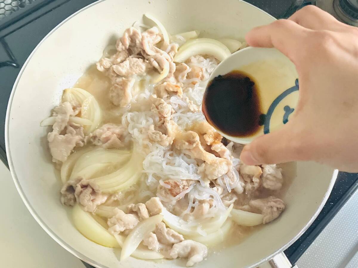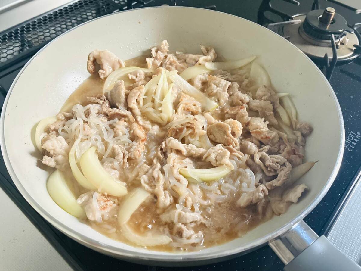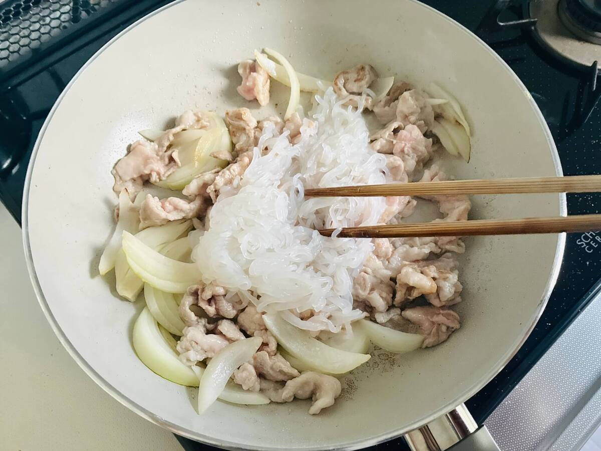 豚肉の色が変わったら糸こんにゃくを加えます。