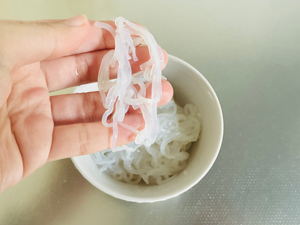 糸こんにゃくは水気をよく切り、食べやすい長さに切ります。