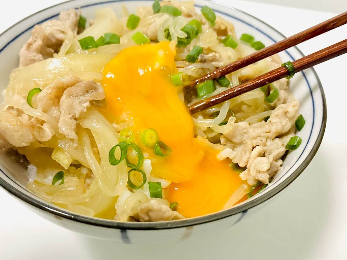 吉野家系のだしが利いた豚丼に、糸こんにゃくの食感や黄身の濃厚さ、刻みネギの彩りなどが加われば……それは、もうご馳走。