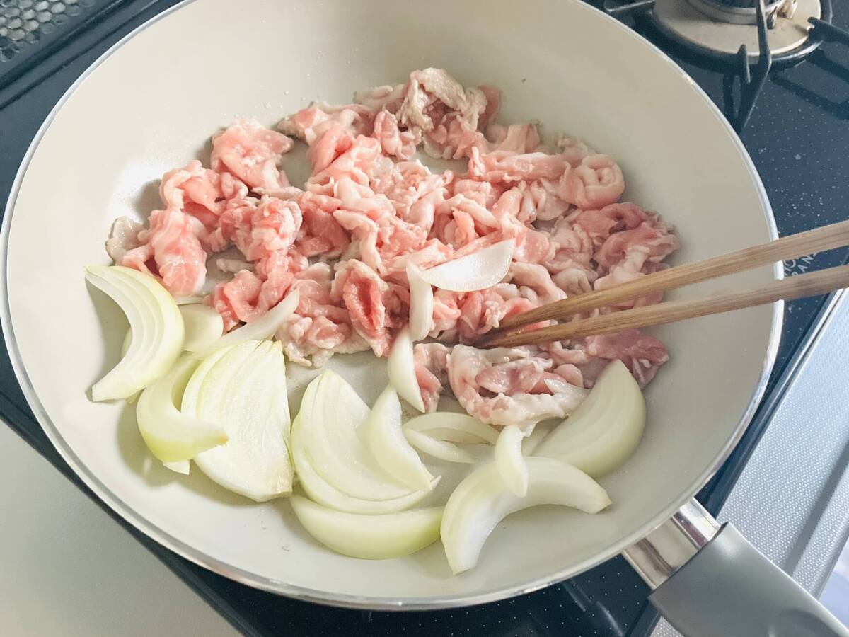 豚肉と玉ネギを入れて炒めます。