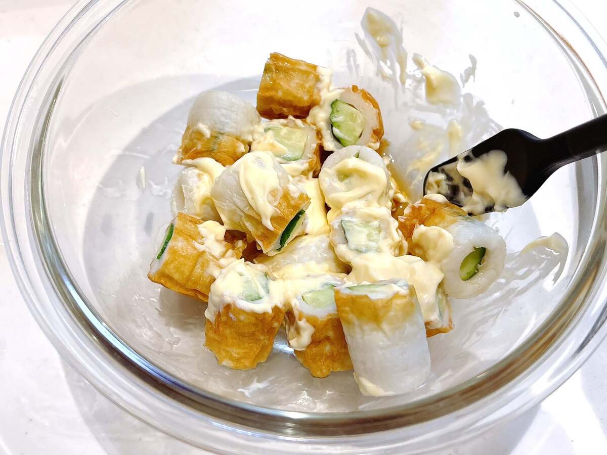 作り方③ちくきゅうをボウルに入れて、マヨネーズ・めんつゆと和える