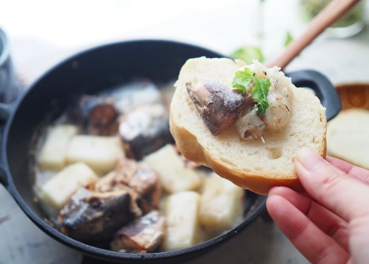 アヒージョといえばエビやタコなど魚介が必要なイメージですが、ストックしてある水煮缶を使えば、買い物不要で作れます♪