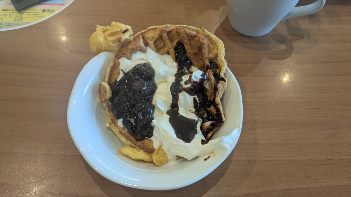 ワッフルは自分で焼く形式で、生地を欲張って入れすぎたためはみ出してしまいました。トッピングもホイップクリーム・チョコレートソース・メイプルシロップなど多様な楽しみ方ができそうです。