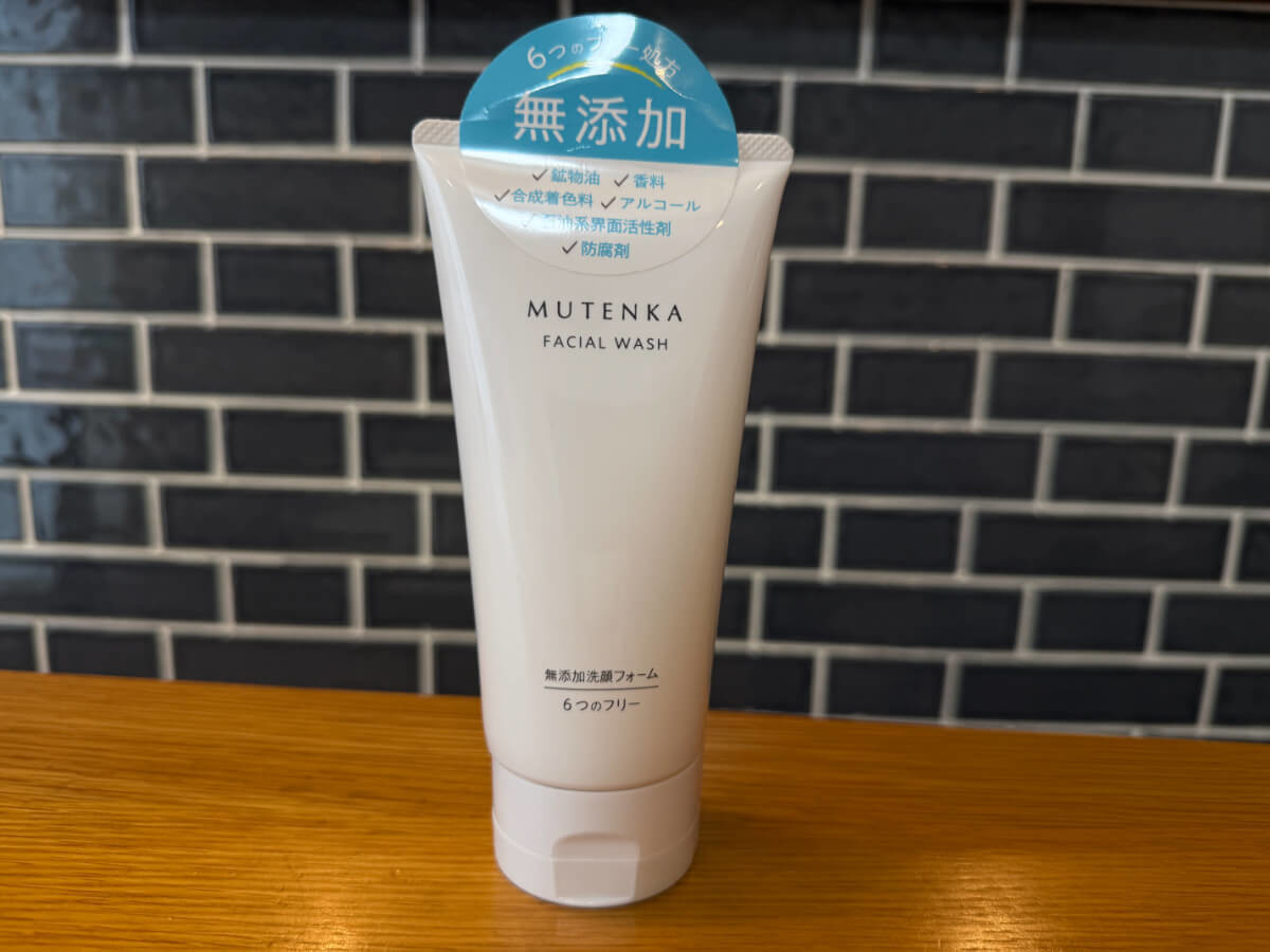 日用品部門のふたつ目は、「MUTENKA 無添加洗顔フォーム」398円。 鉱物油・香料・合成着色料・アルコール・石油系界面活性剤・防腐剤の6つフリーで、敏感肌にとって本当にありがたい一品です。