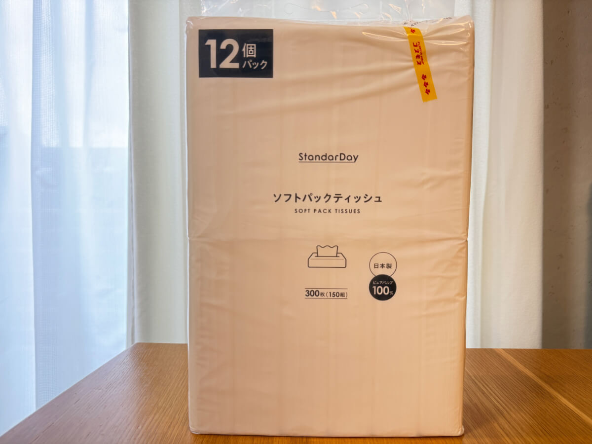 日用品部門のひとつ目は、「StandarDay ソフトパックティッシュ」。300枚(150組)入りが12個セットで548円!1個あたり約46円という驚きのコスパです。