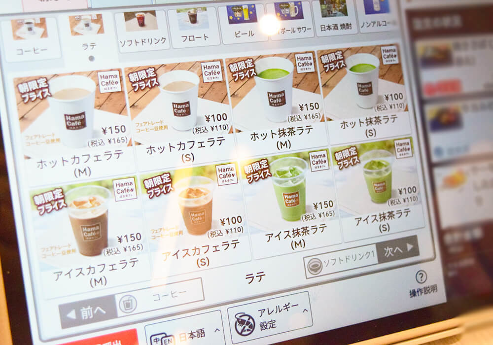 ドリンクは通常価格の約半額で提供されています。例えば、ホットカフェラテ(S)やホット抹茶ラテ(S)は通常220円(税込)のところ、モーニングの時間帯は110円(税込)。かなりお得に楽しめます。