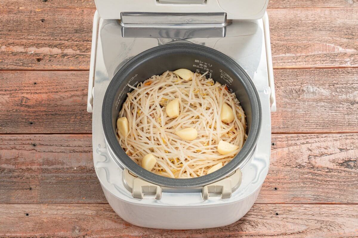 - 「とり釜めしの素」、もやし、にんにくを入れて平らにならしてすぐ炊飯にする