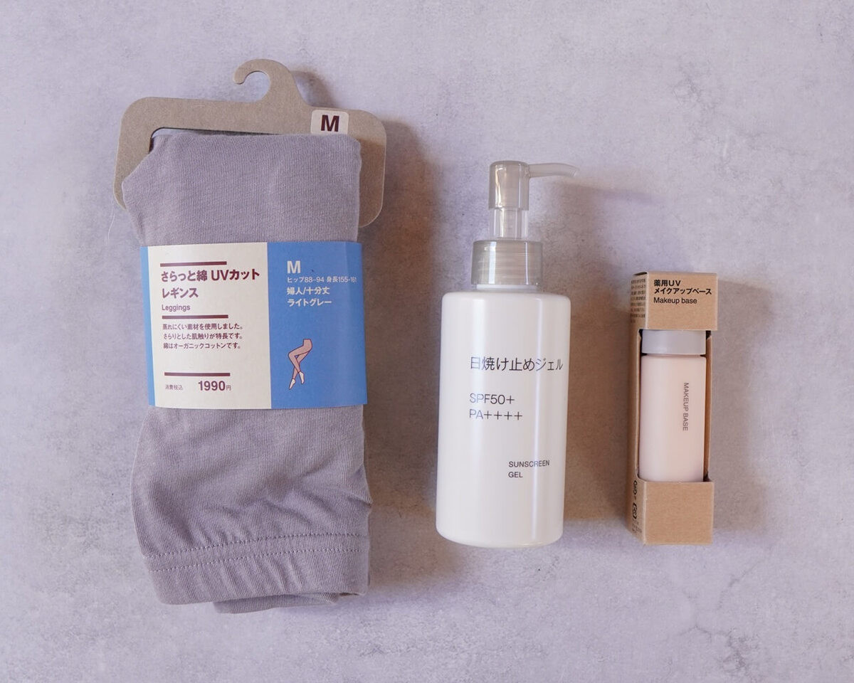 今回のおすすめは、メイク前に便利なUV下地、体用として優秀な日焼け止め、快適に履けるUVレギンス。