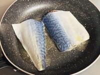 フライパンにオリーブ油適量を中火で熱し、塩サバを身の方から入れて焼きます。