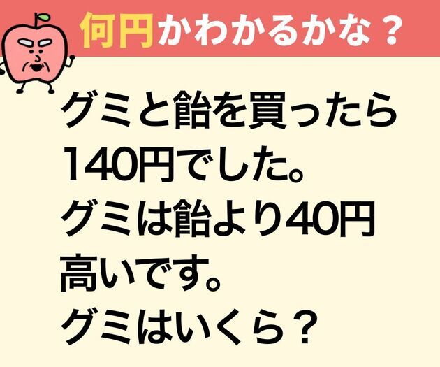 グミと飴を買ったら合計140円に。グミは飴より40円高いとしたら、果たしてグミはいくらでしょうか?