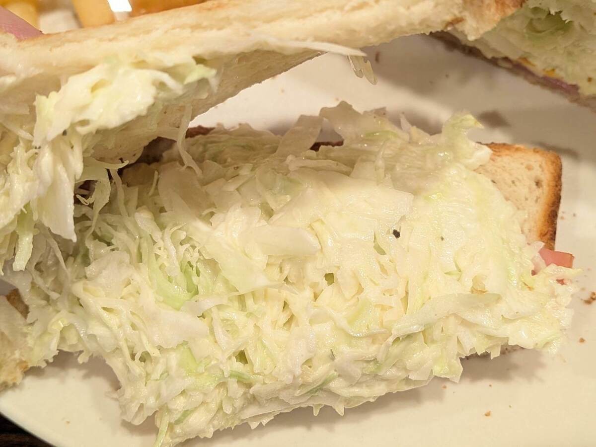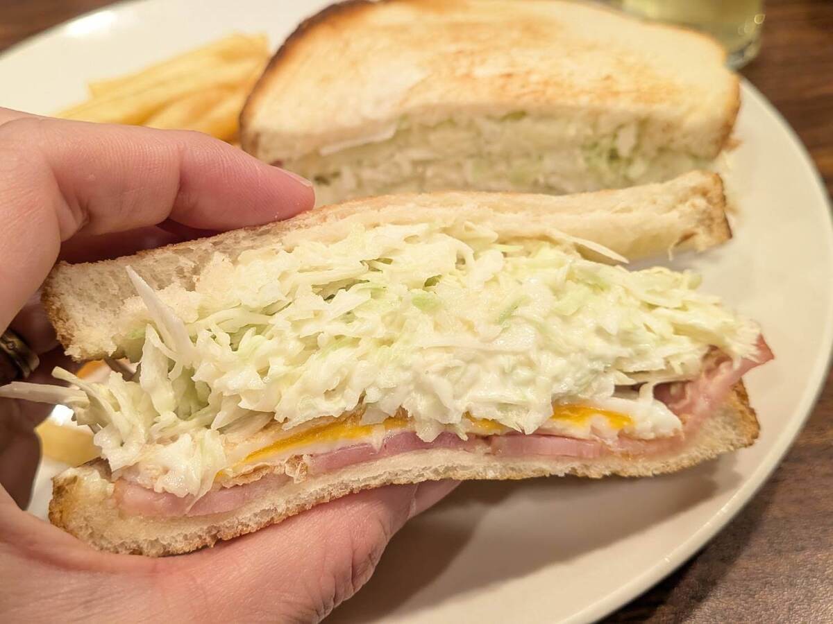 キャベツが主役になりすぎていて、影をひそめていますが、ハムと卵も挟まっていて、朝から、野菜、卵、肉系としっかりパワーチャージできるのが嬉しいです。