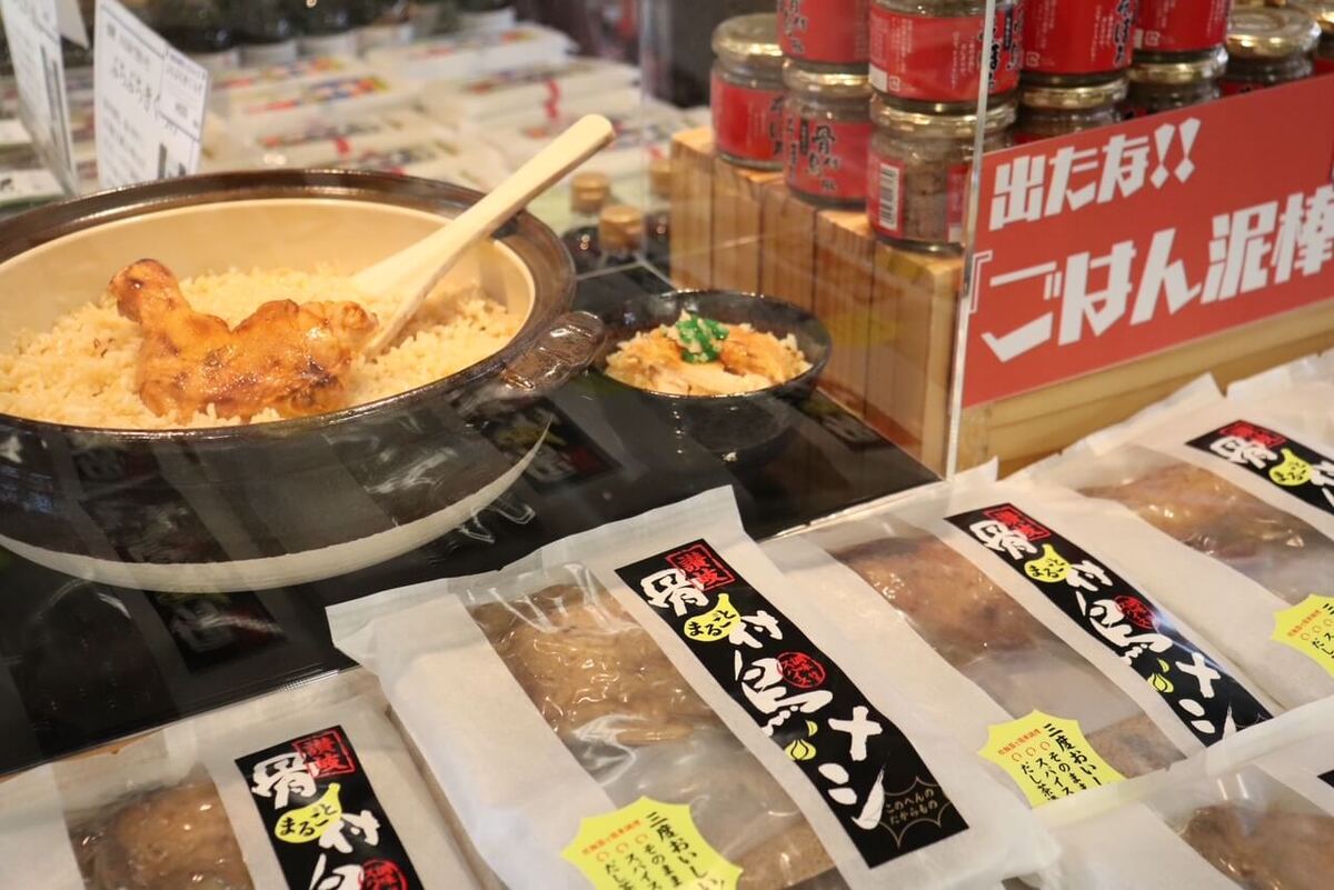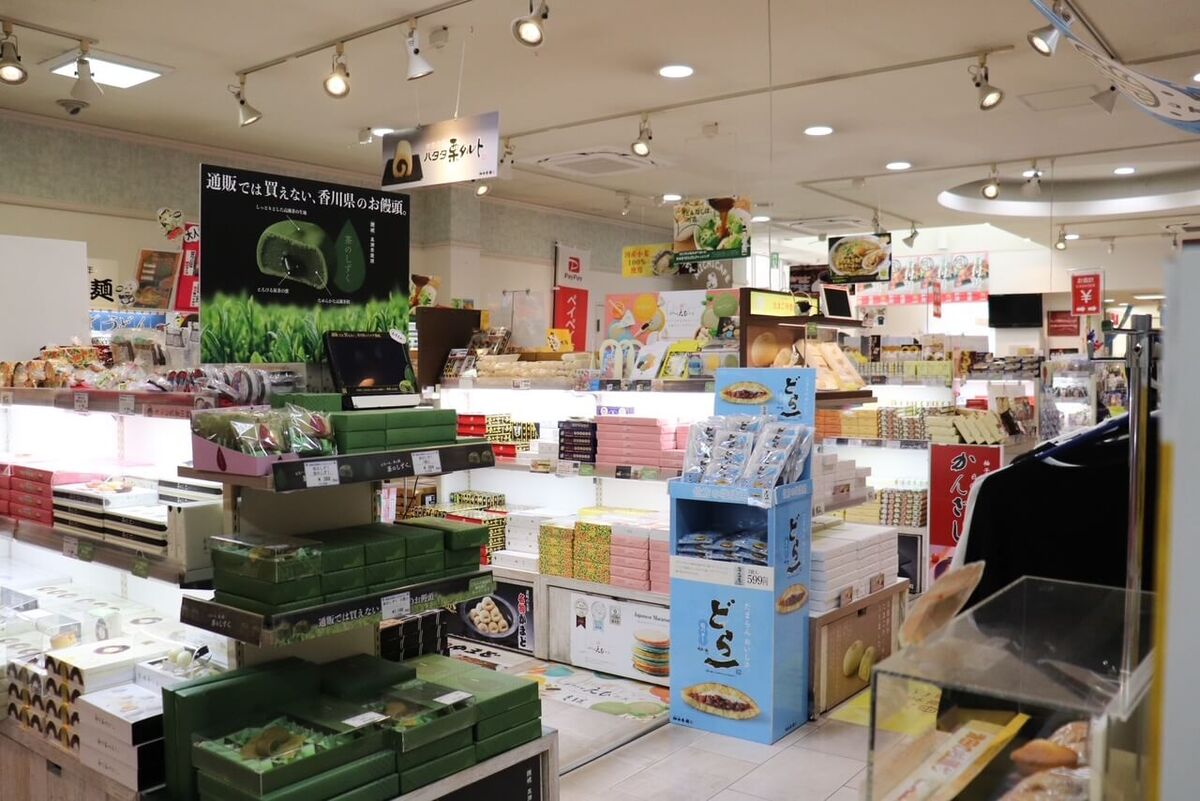 香川県の有名なお菓子、黄味餡を包んだ「名物かまど」からさぬき市の道の駅「みろく」内で製造されている人気スイーツ、四国の旬のフルーツ、定番のうどん、雑貨まで幅広い商品が並んでいました。