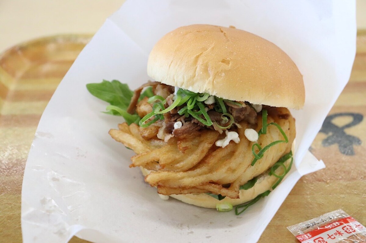 大きなふかふかのバンズに、甘辛く味付けした牛肉と揚げたうどん、トッピングに天かすが挟まっています。