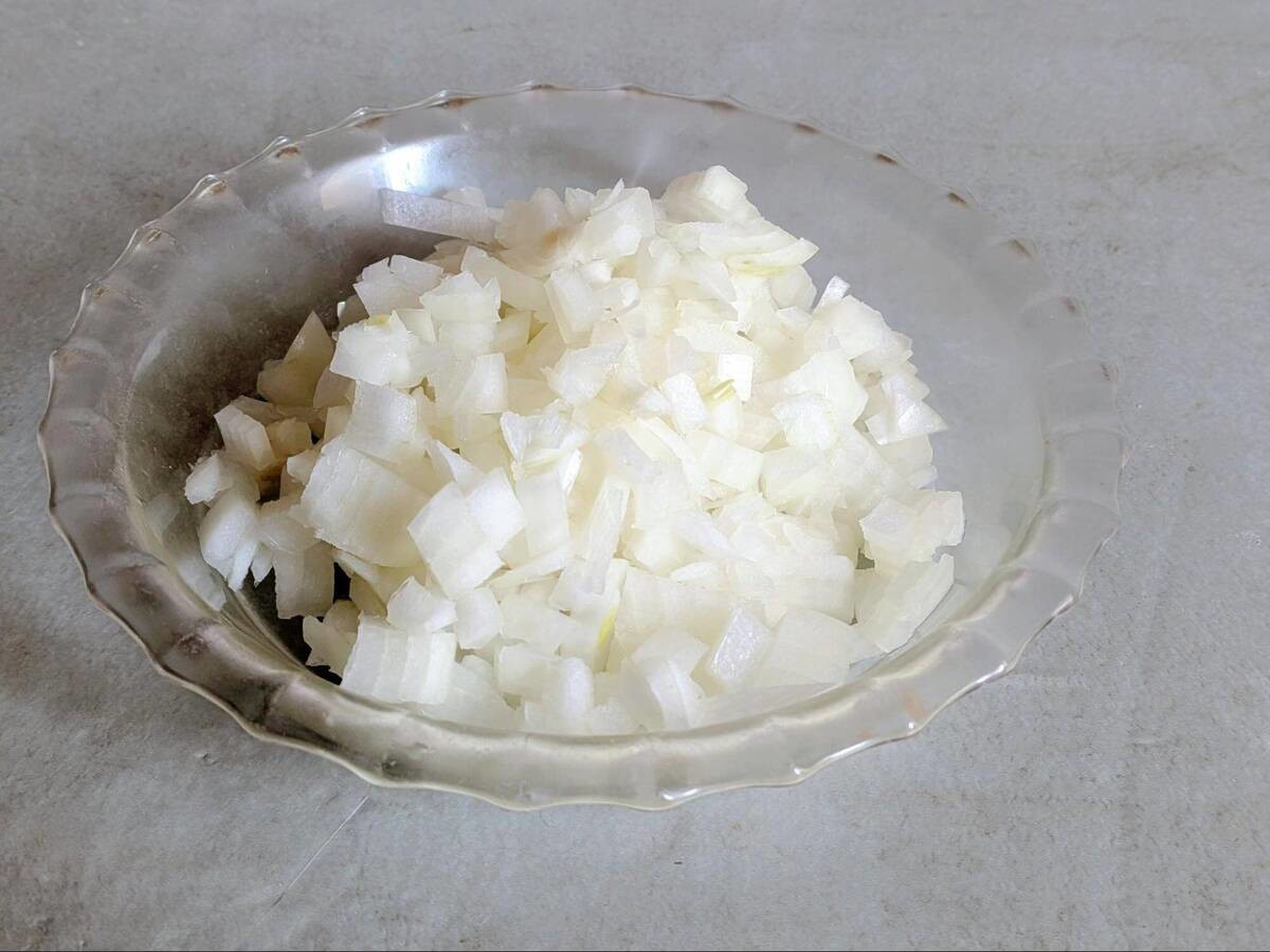 鶏むね肉を焼いている間に、玉ねぎをみじん切りにしてください。