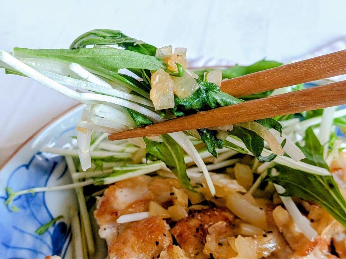 添えた水菜にオニオンソースをつけて食べてみると、これがまた相性抜群。