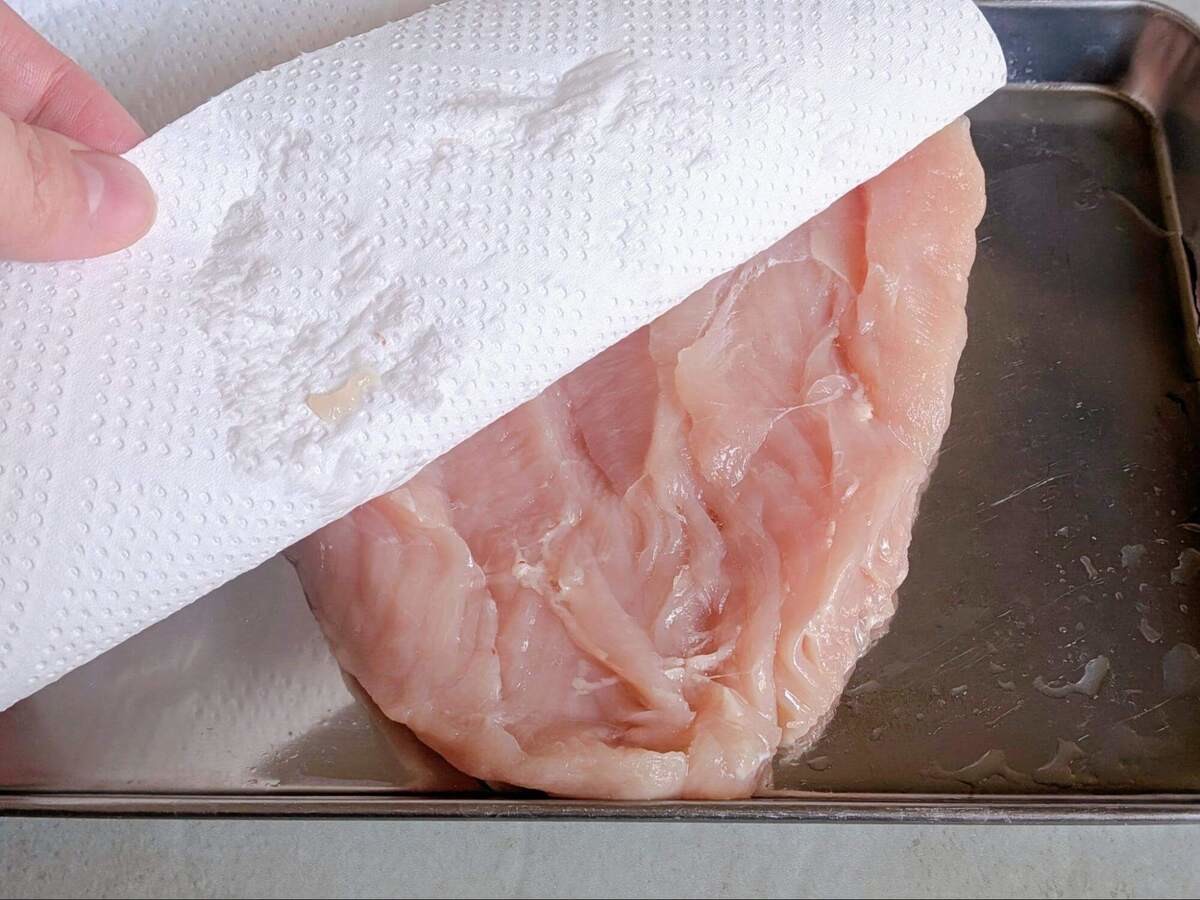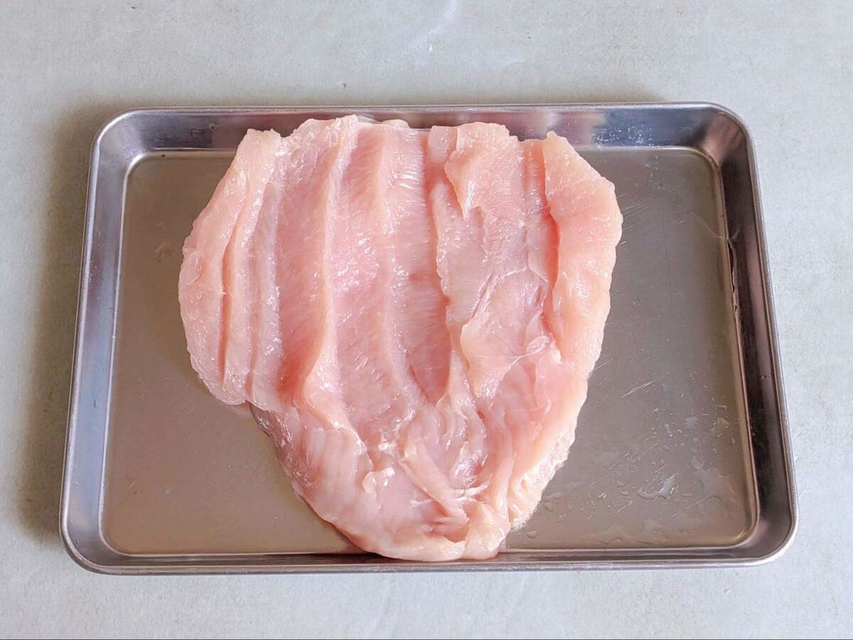 鶏むね肉は観音開きにし、10分ほど室温に置きましょう。