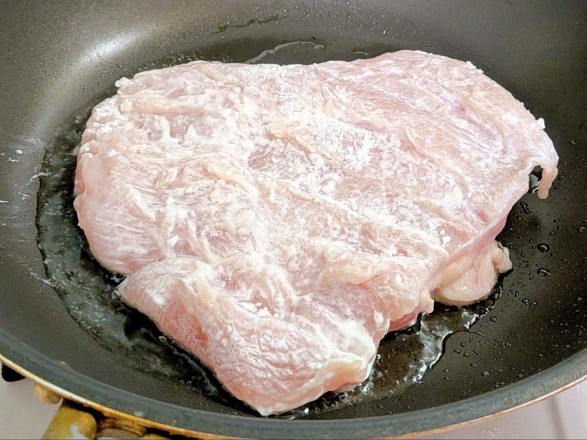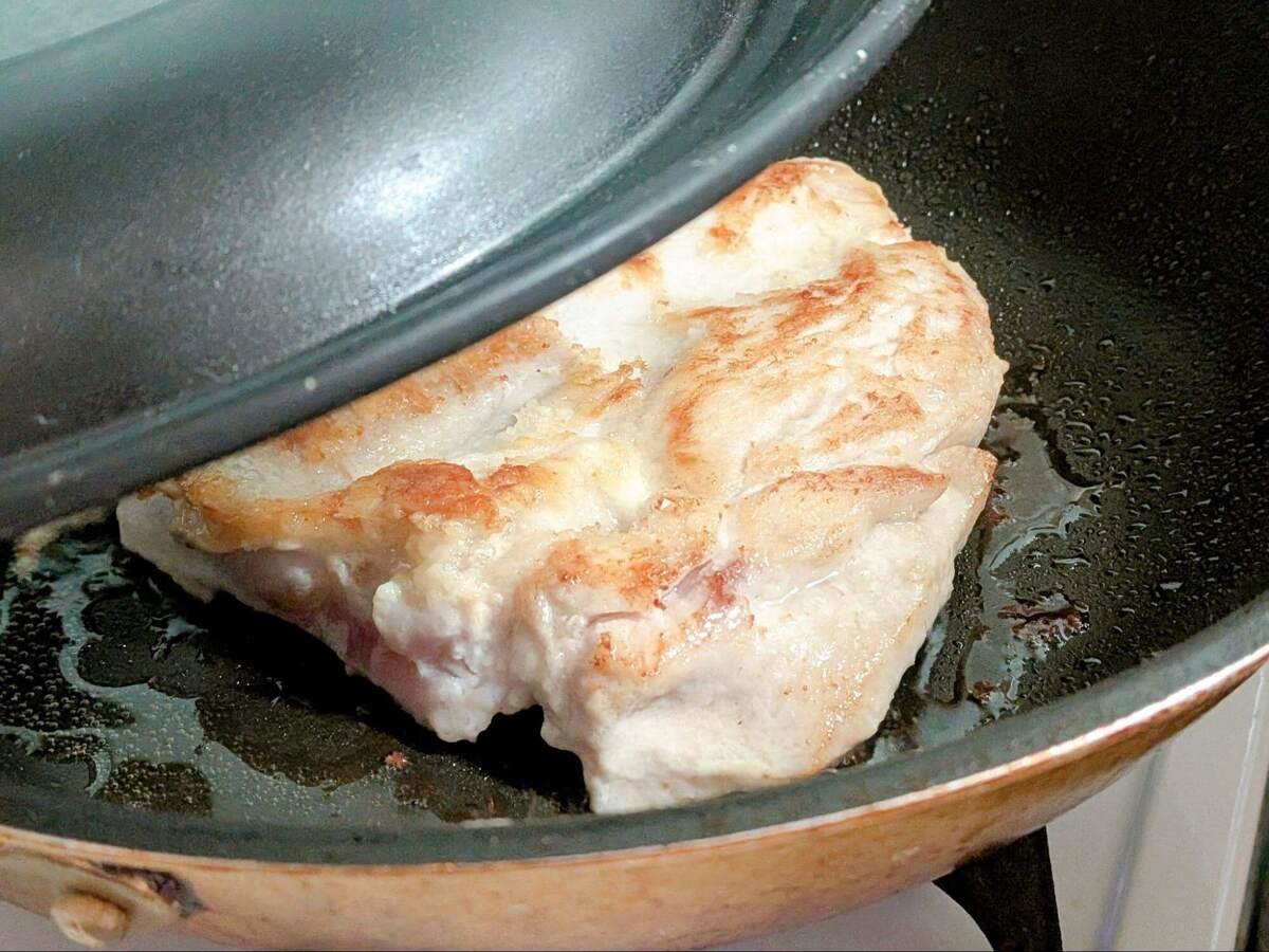中火で熱したフライパンにサラダ油を引き、鶏むね肉の皮目を下にして置いたら、3分焼きましょう。