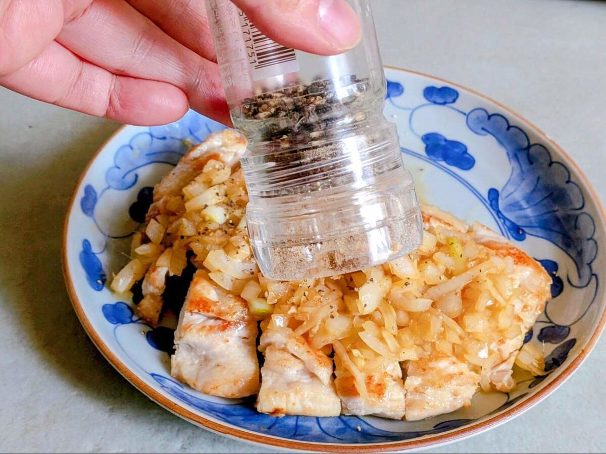 チキンステーキの上に⑤と黒こしょうをかけ、お好みで水菜を添えたら完成です。