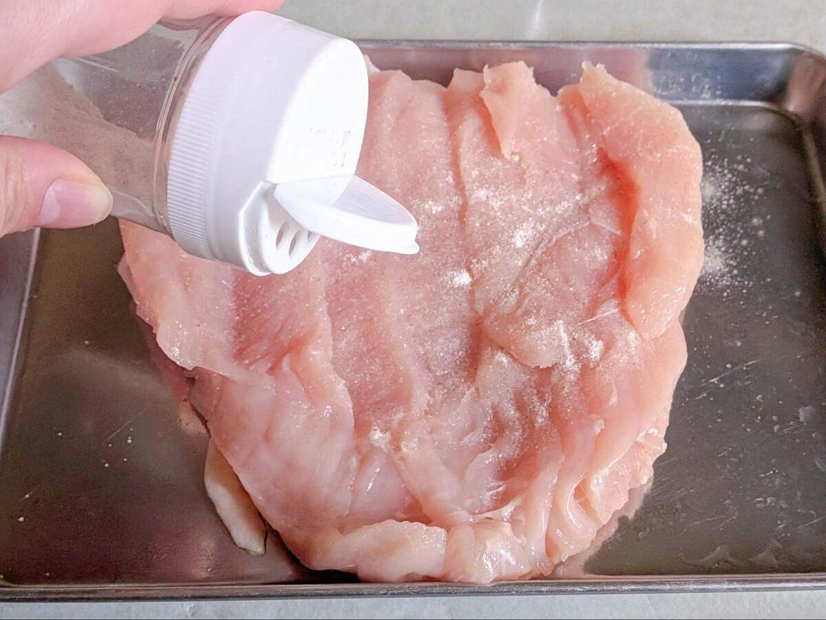鶏むね肉の両面に塩・こしょうをふり、マヨネーズを塗ってください。
