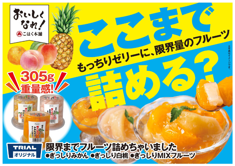 果汁を使ったもっちり食感のゼリーに、製品化ギリギリとなる限界量のフルーツを詰め込んでいます。