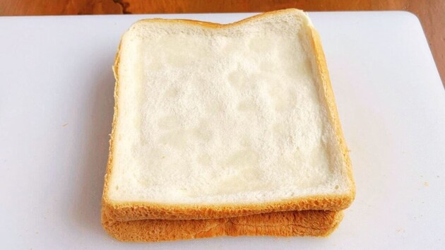 この状態で上から食パンを押し、2枚の食パンを密着させます。