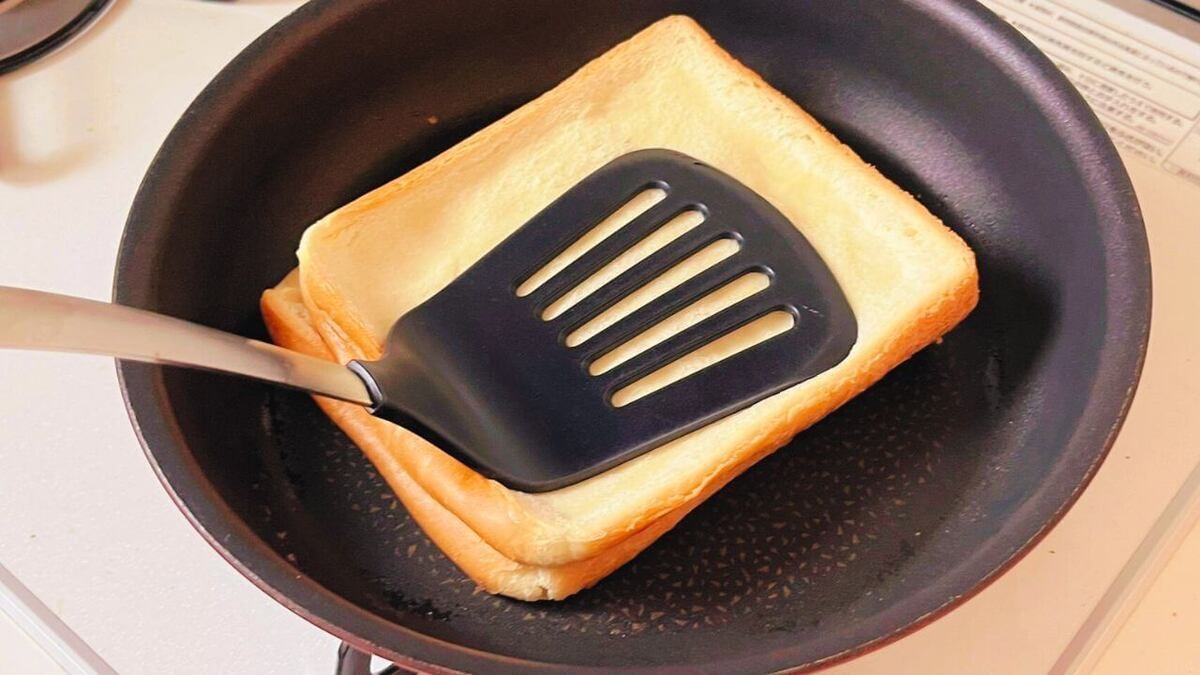 焼いている最中にフライ返しなどを使って、食パンをフライパンにギューっと押しつけ、しっかりと全体に焼き色をつけます。