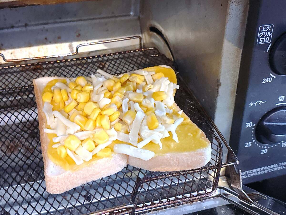 作り方②コーンスープのペーストを食パンに塗り、チーズとコーンをのせて焼く
