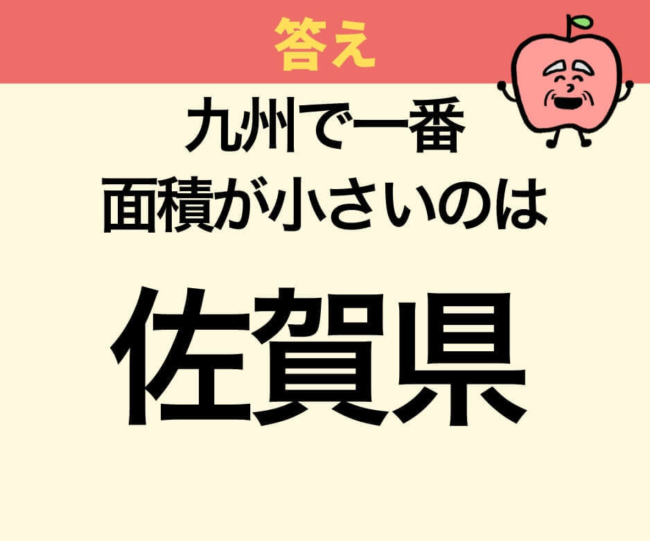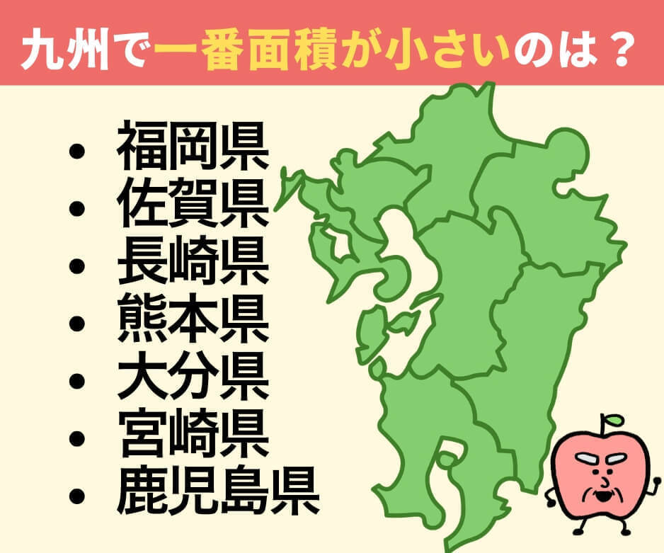 九州地方には、福岡県、佐賀県、長崎県、熊本県、大分県、宮崎県、鹿児島県という、個性豊かな7つの県があります。さて、九州で最も面積が小さい県は、次のうちどれでしょうか?