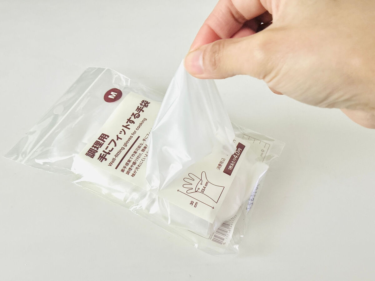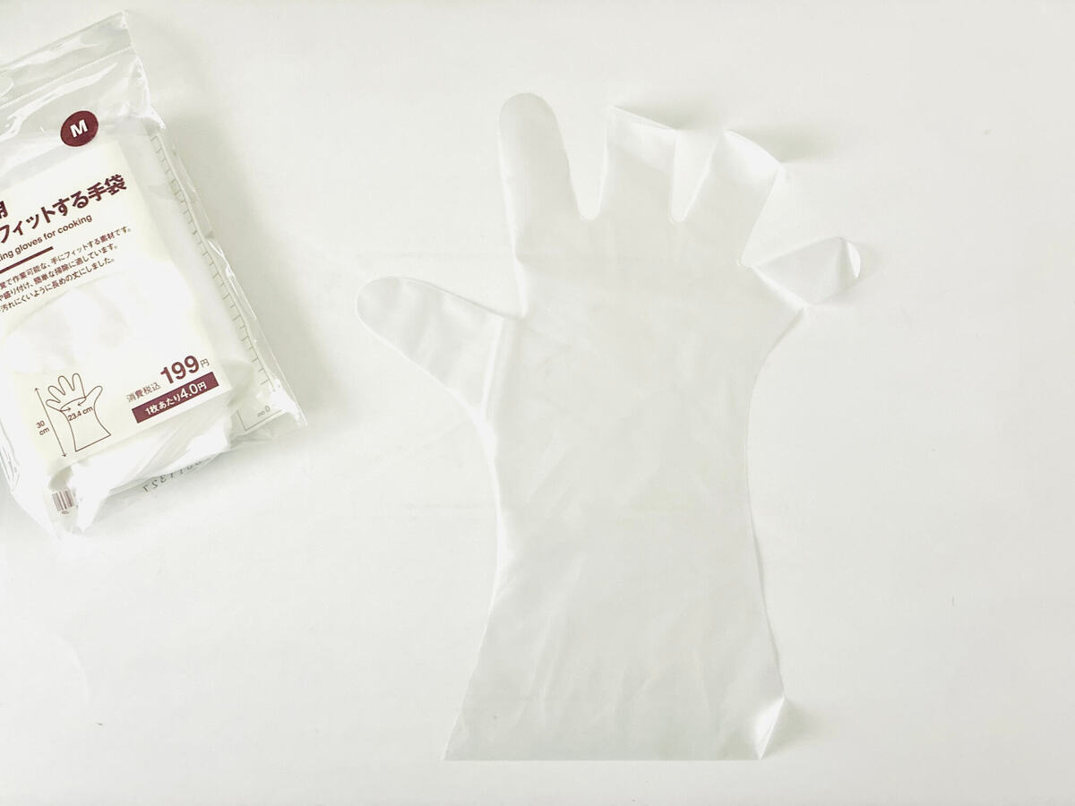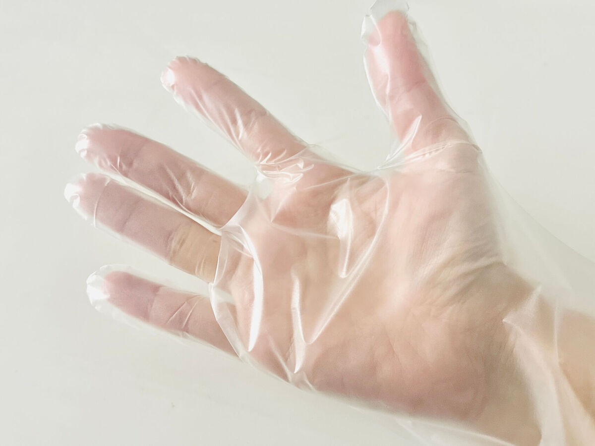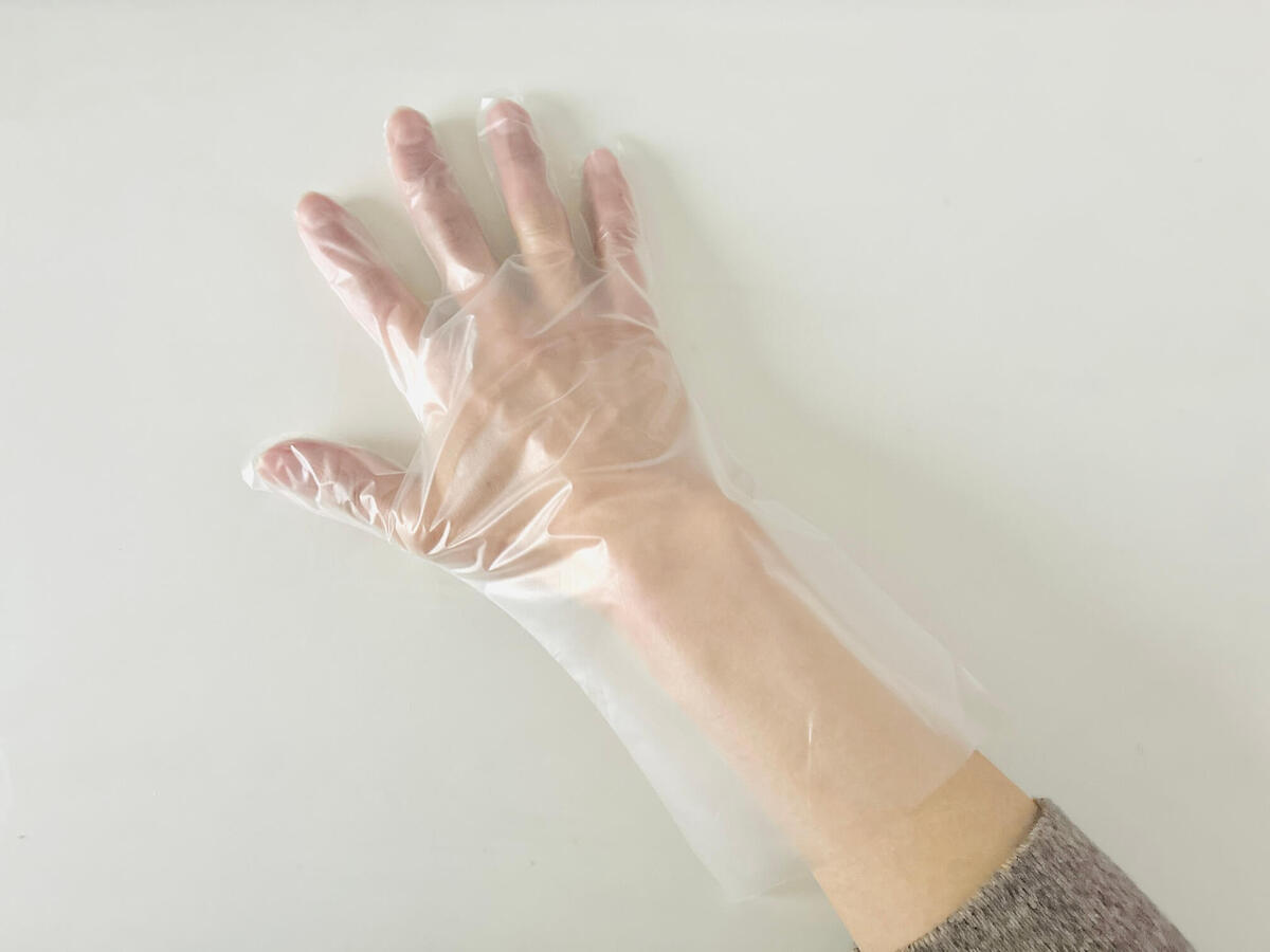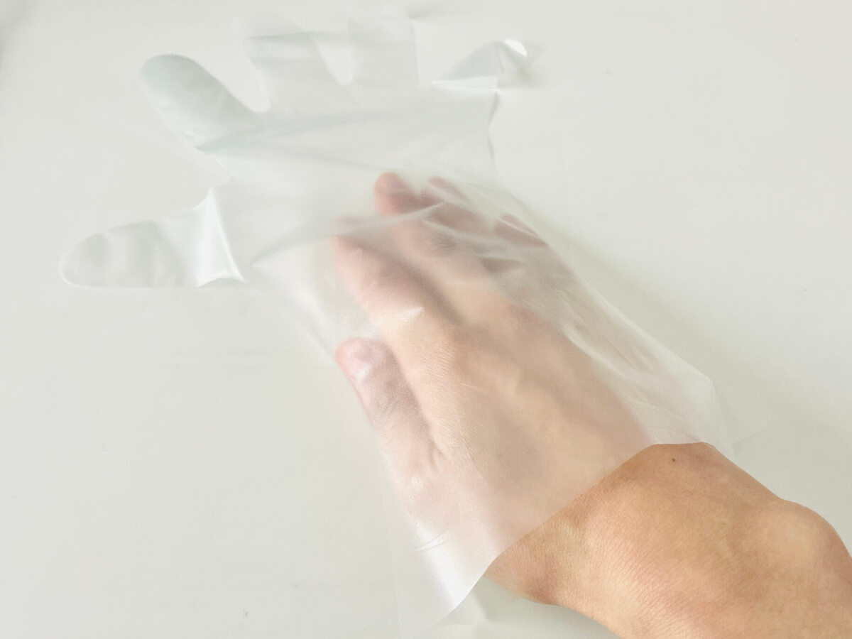ポリエチレン熱可塑性エラストマーという素材で、よくある薄いポリ手袋と薄いゴム手袋の中間ぐらいの絶妙な素材感。やさしく手にフィットしてくれるんです。