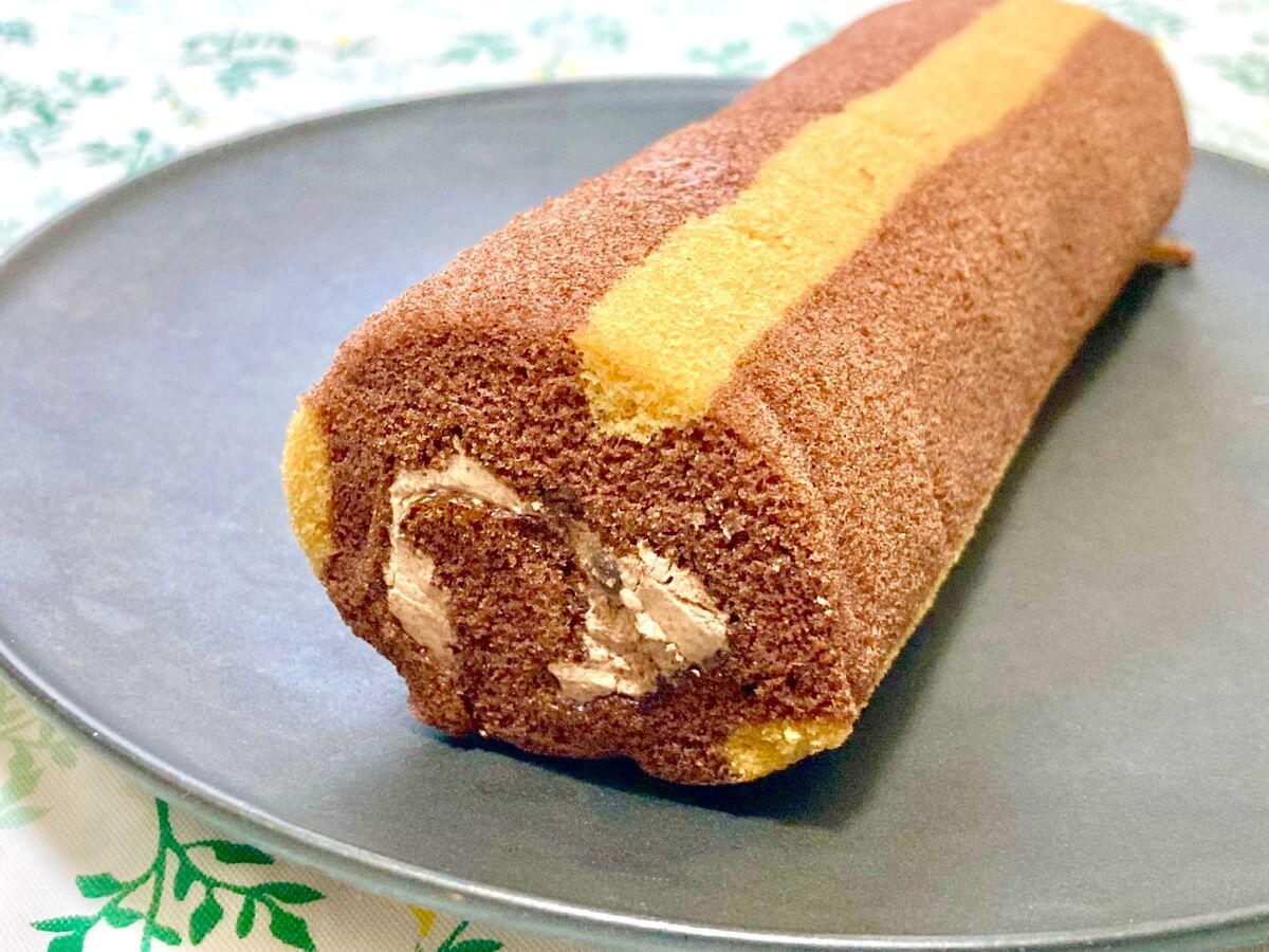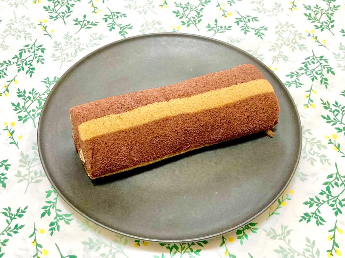 チョコチップ入りチョコクリームを、チョコ味×コーヒー味の縞模様スポンジで巻いたロールケーキ。
