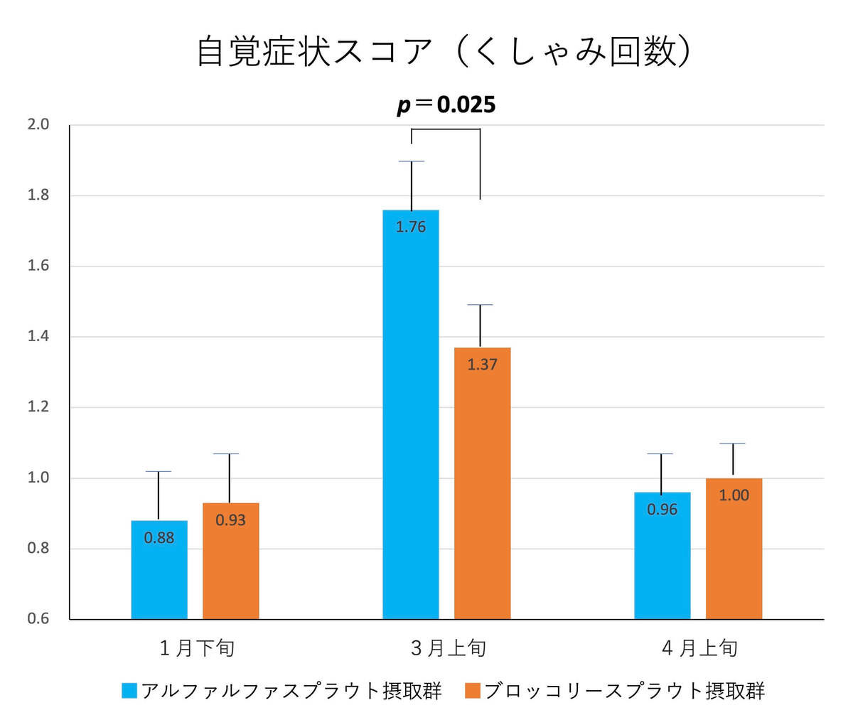 筑波大学 医学医療系つくば機能性食品予防医学研究所の谷中昭典氏の研究によると、ブロッコリースプラウトを1日50g(朝25g、夕25g)摂取したグループでは、花粉大量飛散期におけるくしゃみ回数の有意な減少効果が認められました。