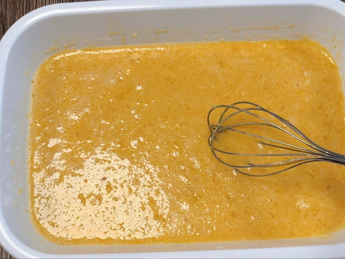 切り終わったら、すべて卵液に浸しておきましょう。ケンミン食品のライスペーパーは少しかための質感なので、しっかり浸して卵液を吸わせるのがコツです。