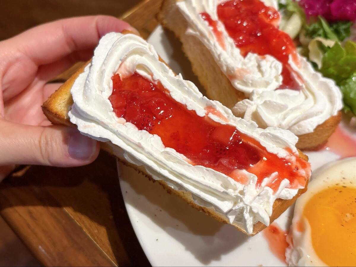 まずはトーストから。ほどよい甘さのホイップと甘酸っぱいイチゴジャムがたっぷりのっています。