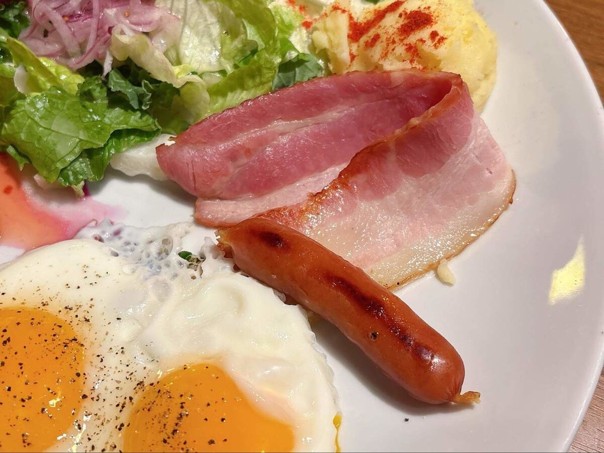 ベーコンはしっかりとした厚みがあり、ほどよい弾力。目玉焼きと一緒に食べると、また格別です。
