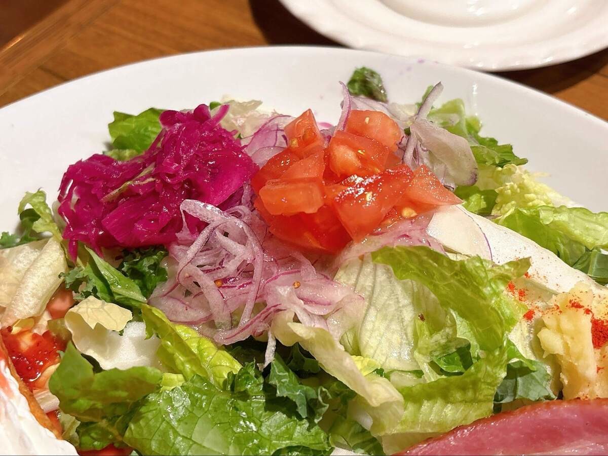 途中でマッシュポテトと一緒に食べると、酸味とまろやかさが合わさって◎。野菜たっぷりで、サラダだけでもおなかが満たされそう。