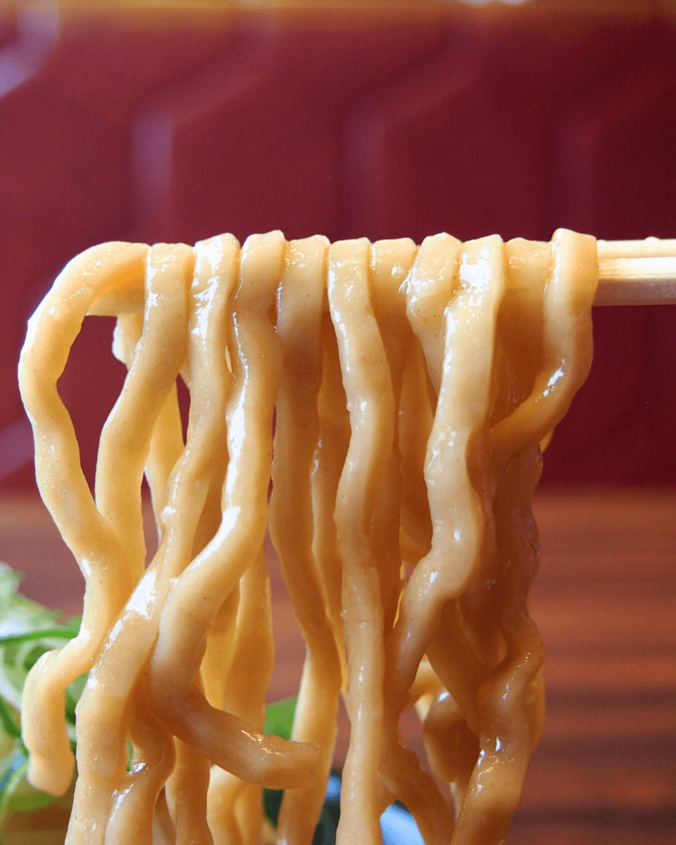 「食べ応え」と「スピード」を両立させるため、2年以上の歳月と100回以上の試食を実施。粉の配合を追求し、ついに業界標準の半分以下となる「茹で時間2分30秒」を実現しました。
