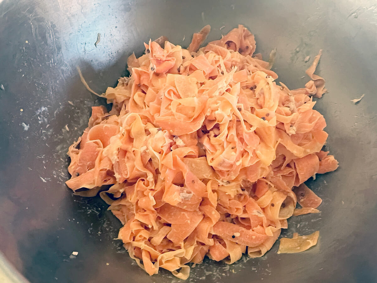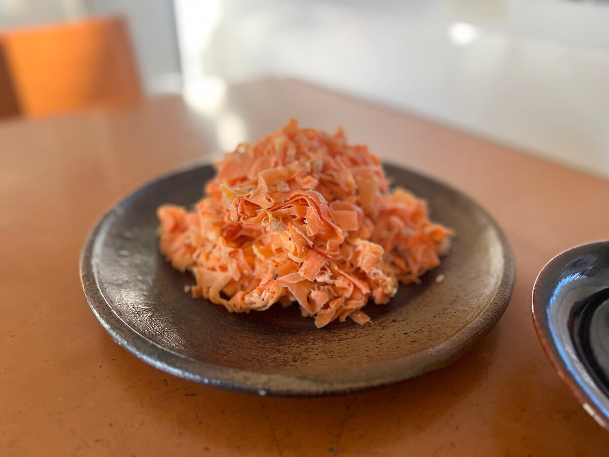にんじんは薄いのですが、面積がそれなりにあり、食感としては平たい麺のような印象です。