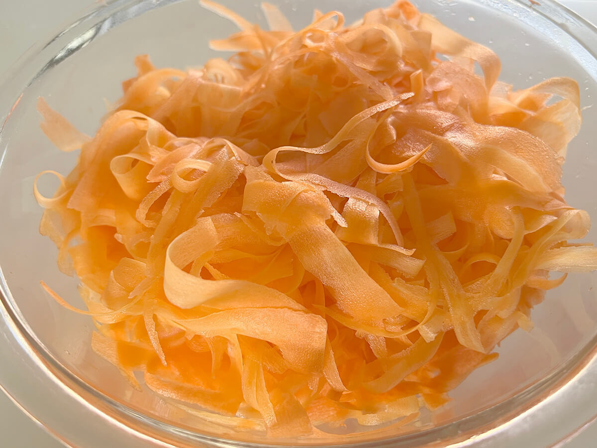 にんじんは皮をむいて、ピーラーでスライスします。