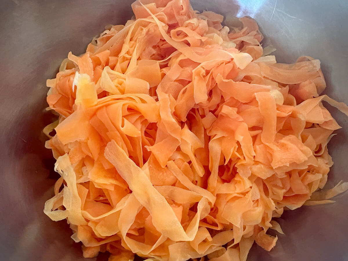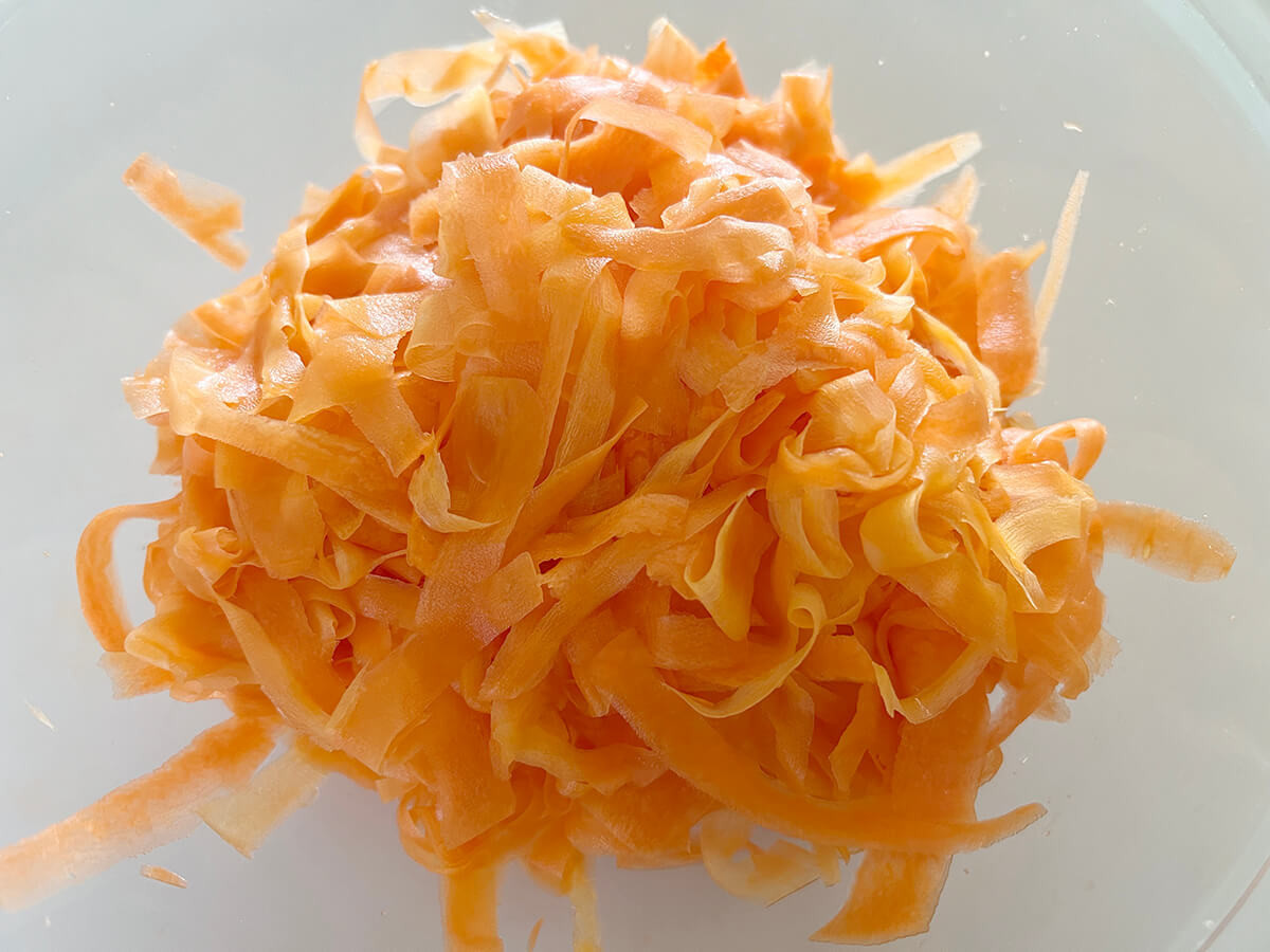 たっぷりのにんじんスライスができました。うちのピーラーはIKEAのものですが、かなり薄く削れるタイプのものです。