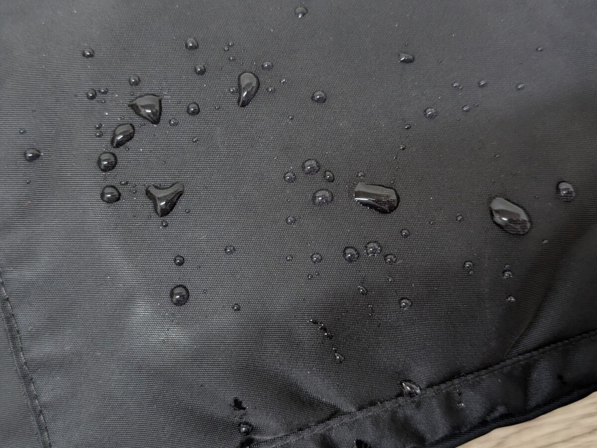 試しにバッグに吹きかけた後、少量の水をかけて防水効果を検証。写真のとおり、しっかり水を弾いてくれました!