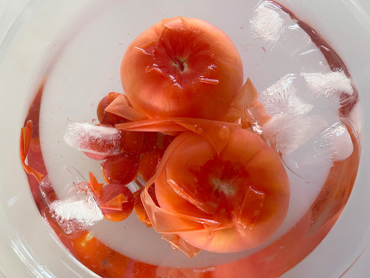 氷水を準備して、お鍋にお湯を沸かし、トマトを入れて30秒転がします。あまりに時間がなくてお湯に入っているところは写真に撮れませんでした。