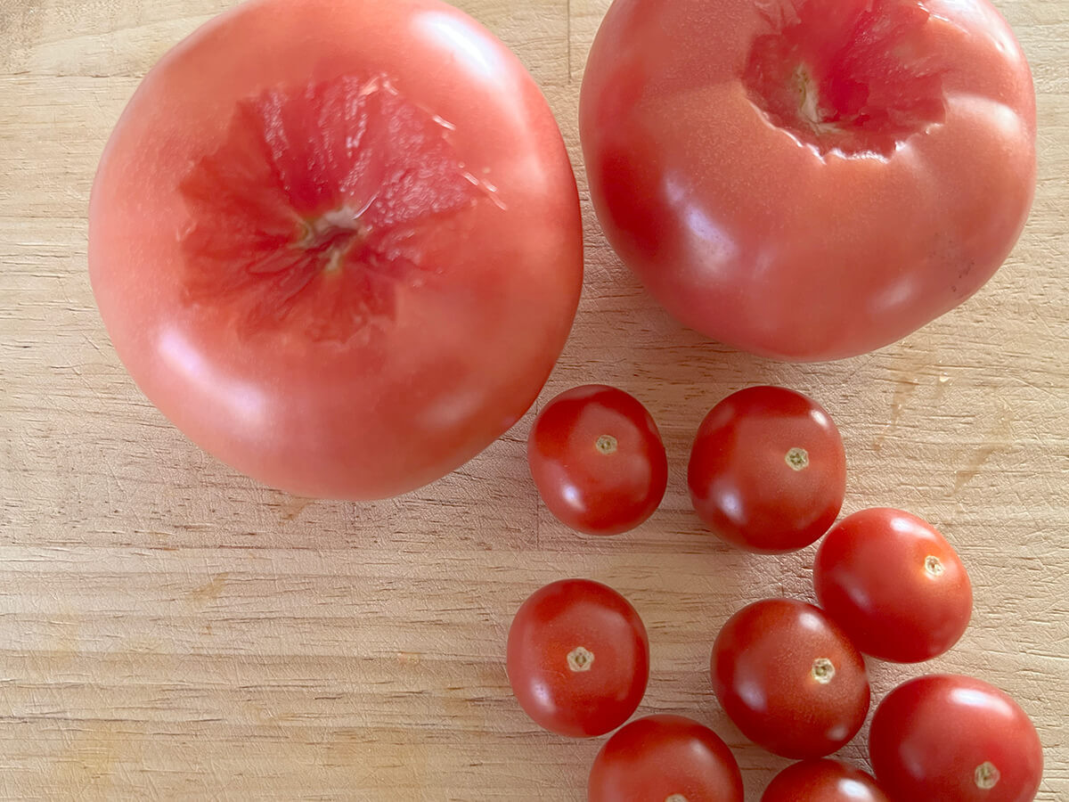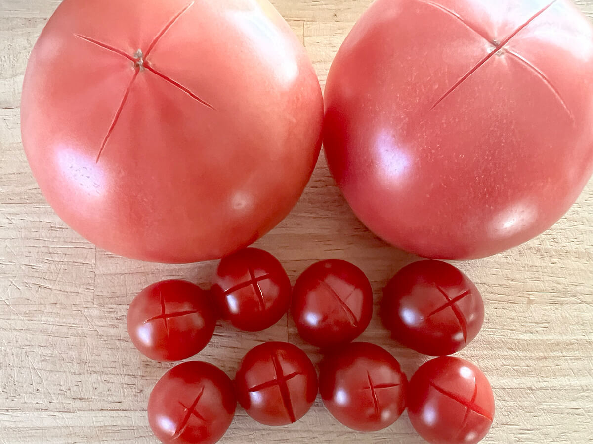 大きいトマトはへたをくりぬき、プチトマトのへたは取り除きましょう。