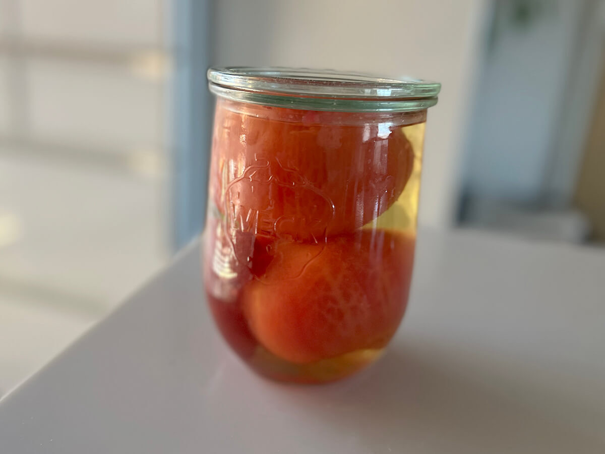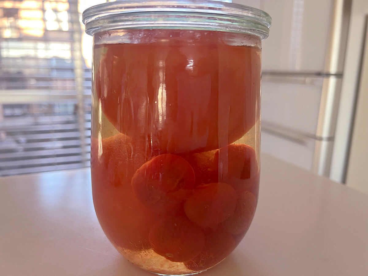 大きなトマトは長めに漬けた方がおいしいそうなので、ひと晩おいてみることにします。