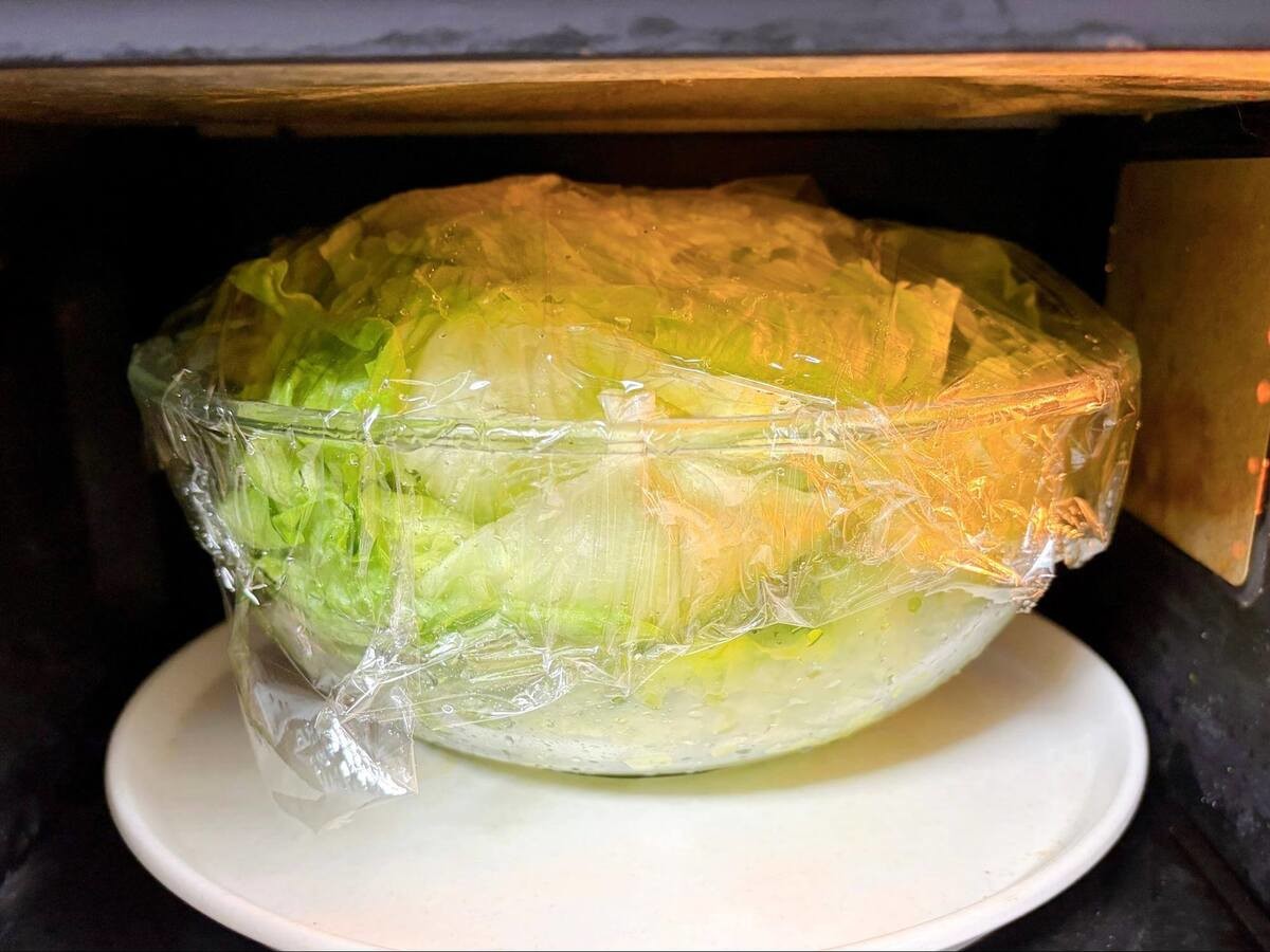 1枚ずつはがして洗ったら、耐熱容器に入れましょう。ラップをして600Wで8分加熱します。