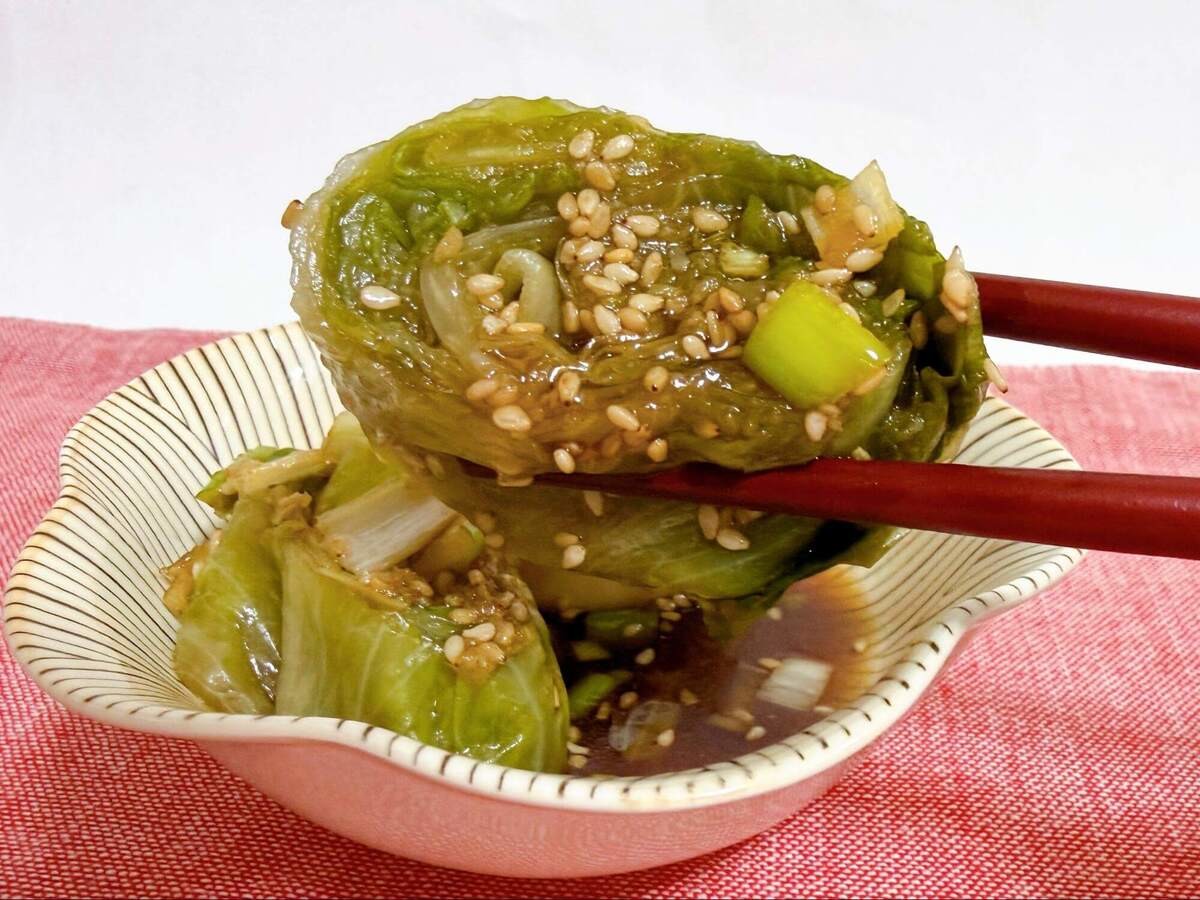 レタスを電子レンジで加熱して、くるくるとロールしたものを特製のタレに漬け込みます。